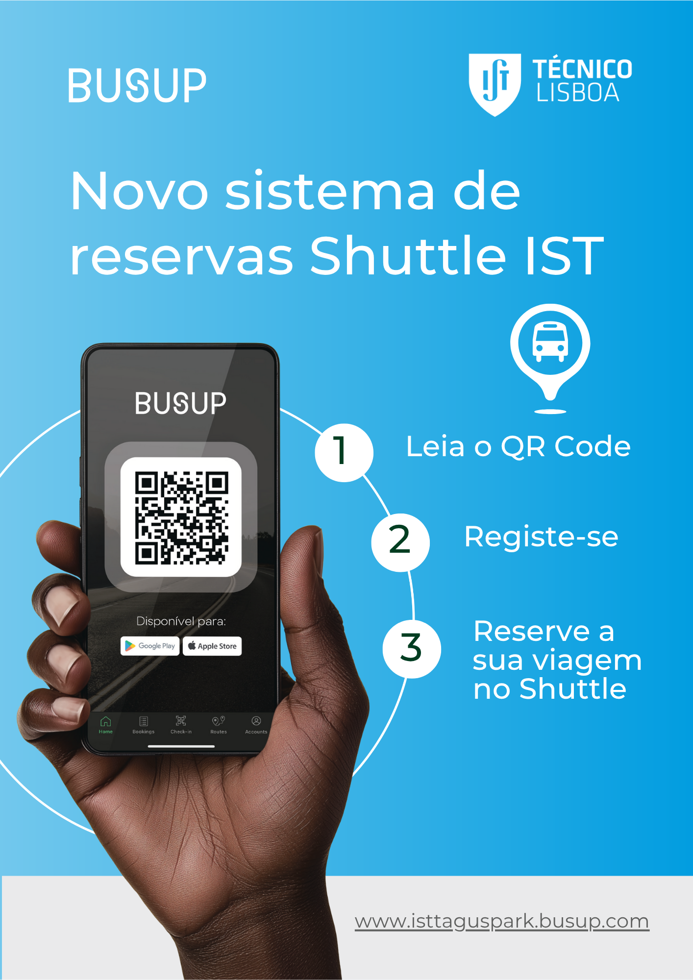 A partir de 4 de junho, o sistema de reservas do Shuttle passa a ser feito através da plataforma BusUp, tornando o processo mais simples, rápido e intuitivo. Como reservar: 1. Login em isttaguspark.busup.com (A autenticação mantém-se com o ISTid); 2. Instalar a app BusUp; 3. Fazer a reserva. Novas funcionalidades: • Reserva/cancelamento até ...