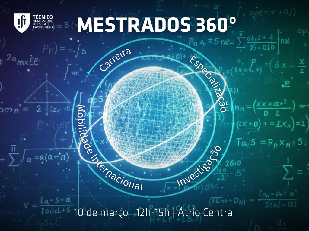Data: 10 de março Hora: Das 12h às 15h00 Local: Átrio Central, Técnico – Campus Oeiras No dia 10 de março, entre as 12h00 e as 15h00, o Campus Oeiras organiza o “Mestrados 360º”, um evento dedicado a dar visibilidade e a valorizar a oferta de mestrados do campus. Ao longo da ...