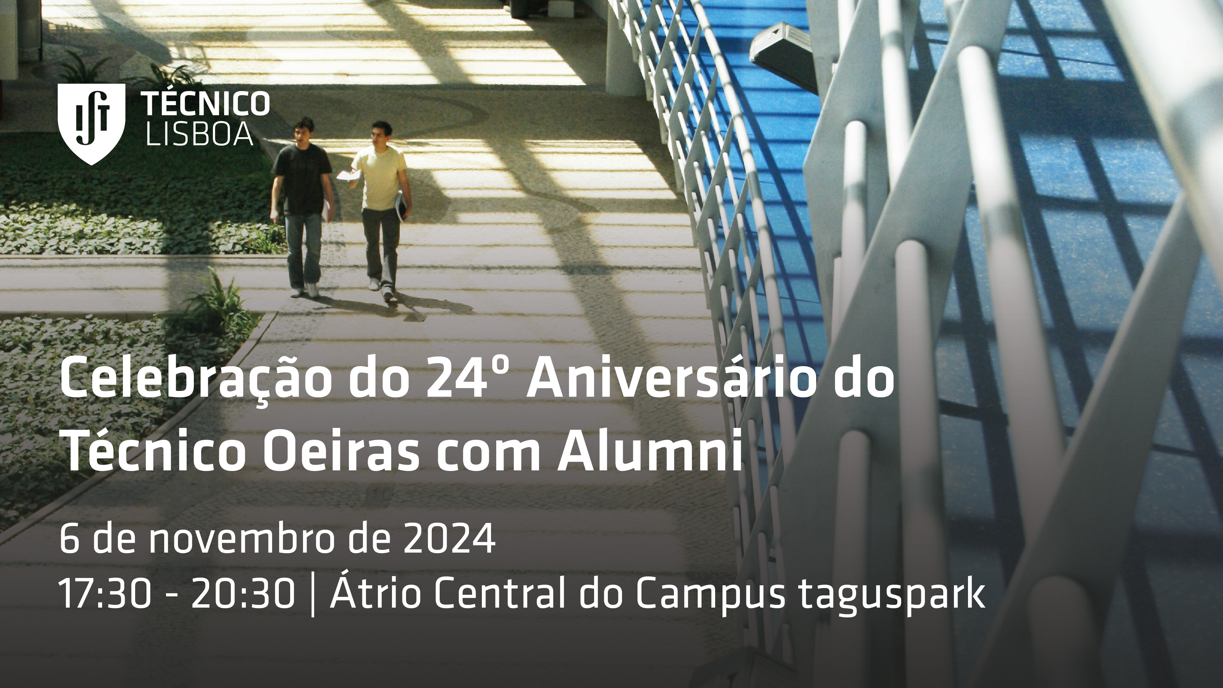 Data: 6 de novembro, 2024 Hora: 17h30- 20h30 Local: Átrio Central – Campus Taguspark Mais informações: Inscrições Vamos celebrar o 24.º aniversário do Técnico Oeiras e queremos reunir todos aqueles que fizeram parte desta jornada. Um momento especial para partilhar experiências, reencontrar antigos colegas e professores e fortalecer a ligação entre o Técnico ...